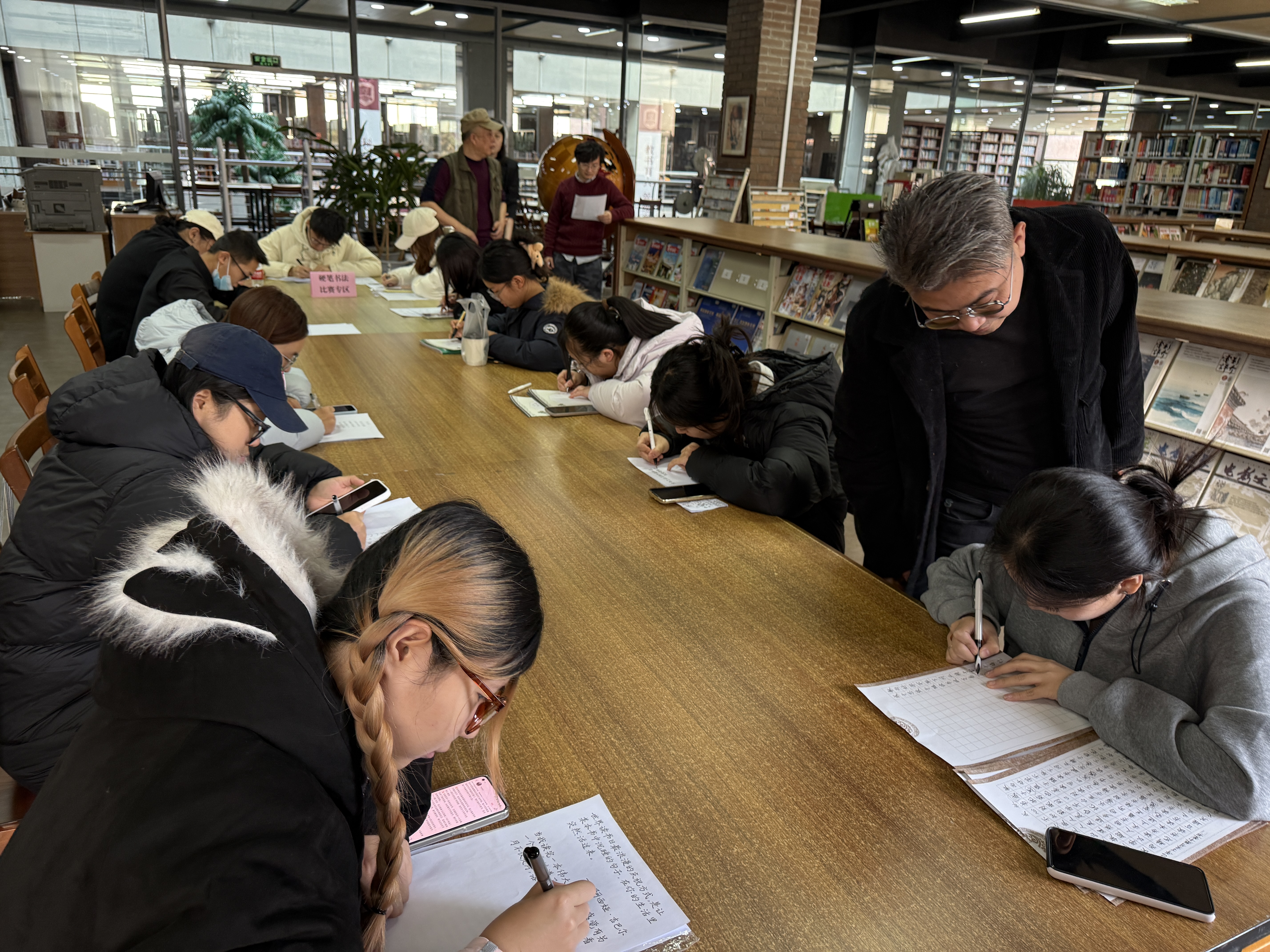 “挥毫品书香 墨韵谱真情”第七届书法大赛起笔仪式后,大赛正式开启,参赛者们或凝神静气,或挥洒自如,笔尖在纸上游走,留下一个个方正遒劲的汉字,整个现场笔墨飘香,作品随即展出。